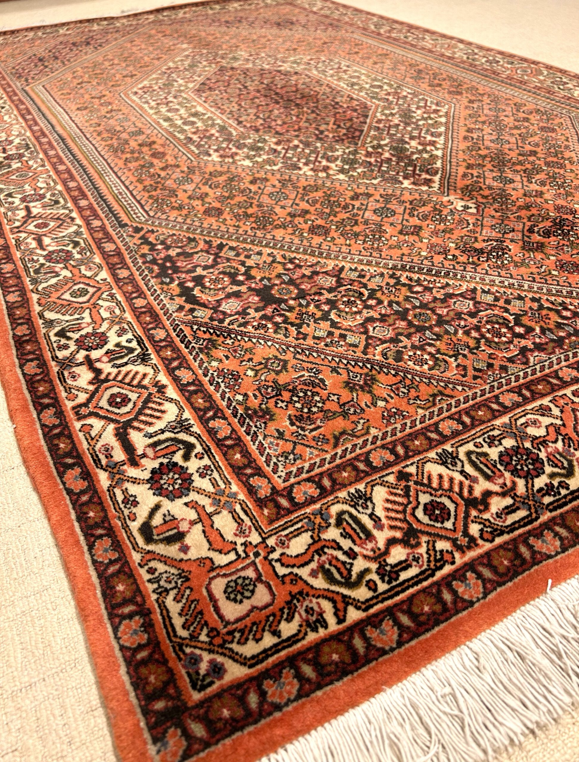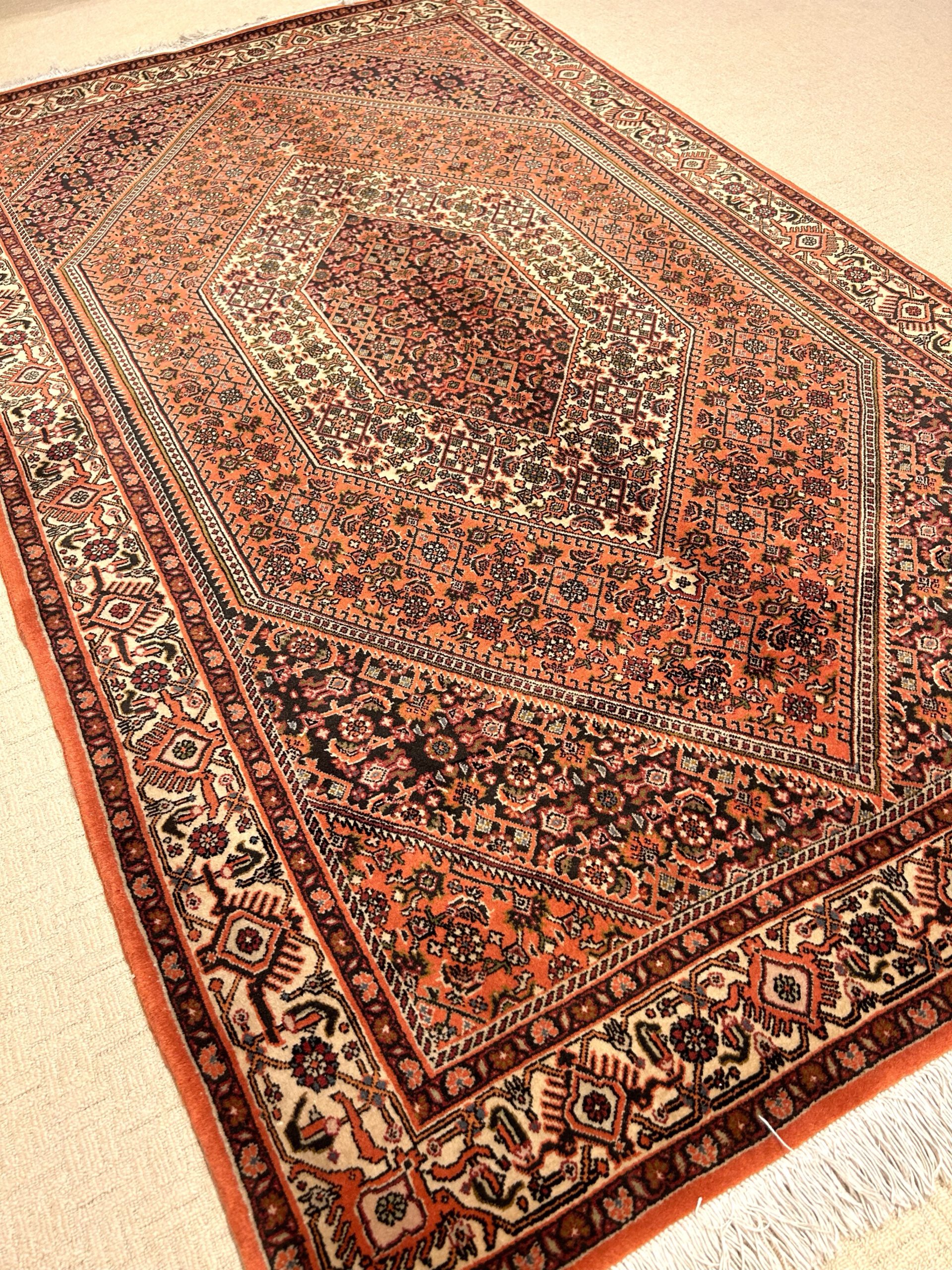 Teppiche wie dieser, der in der Stadt Bidjar geknüpft wurde, wurden auf einer stark komprimierten, äußerst stabilen Grundlage geknüpft, was ihnen den Beinamen „Die Eisenteppiche Persiens“ einbrachte.