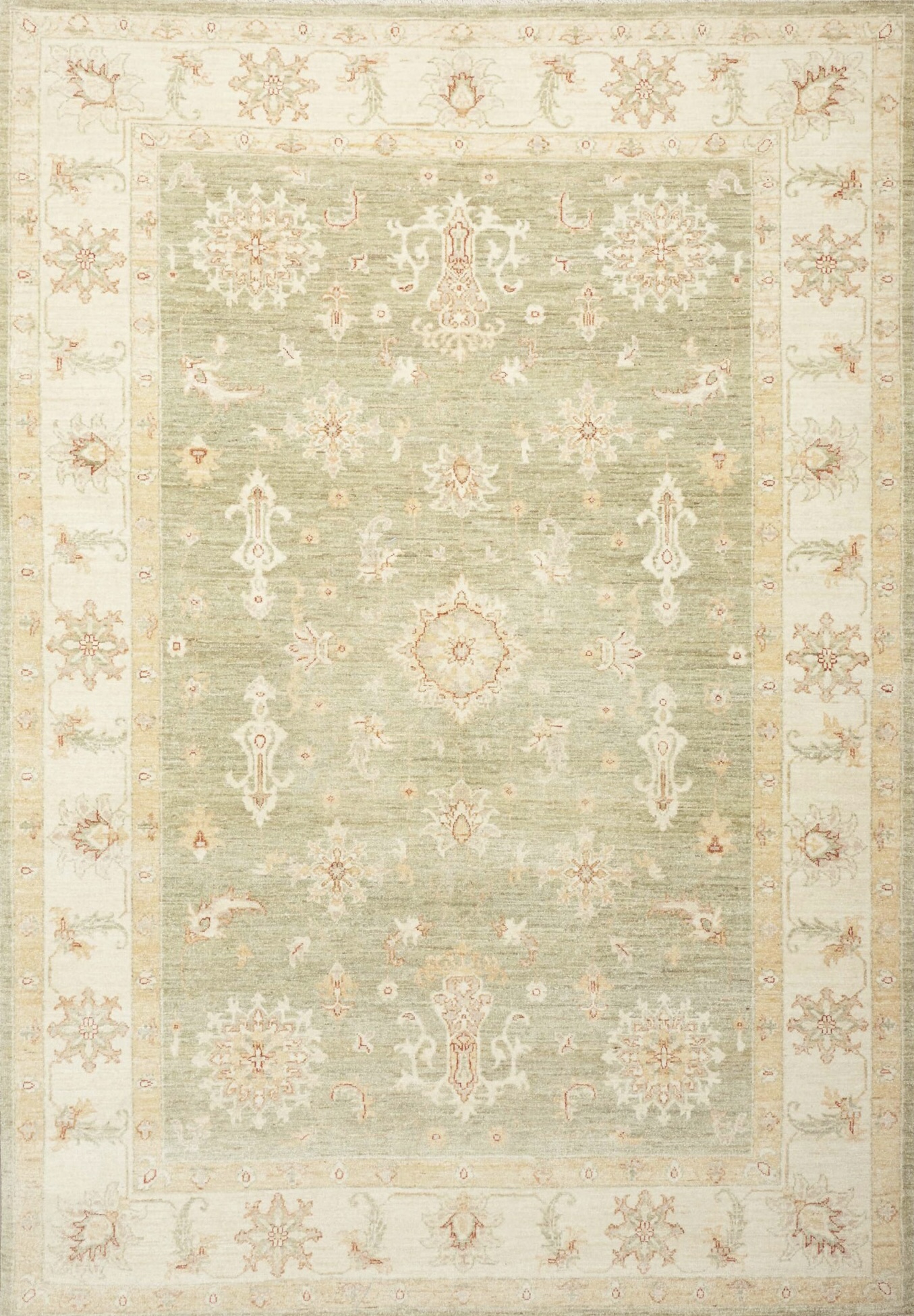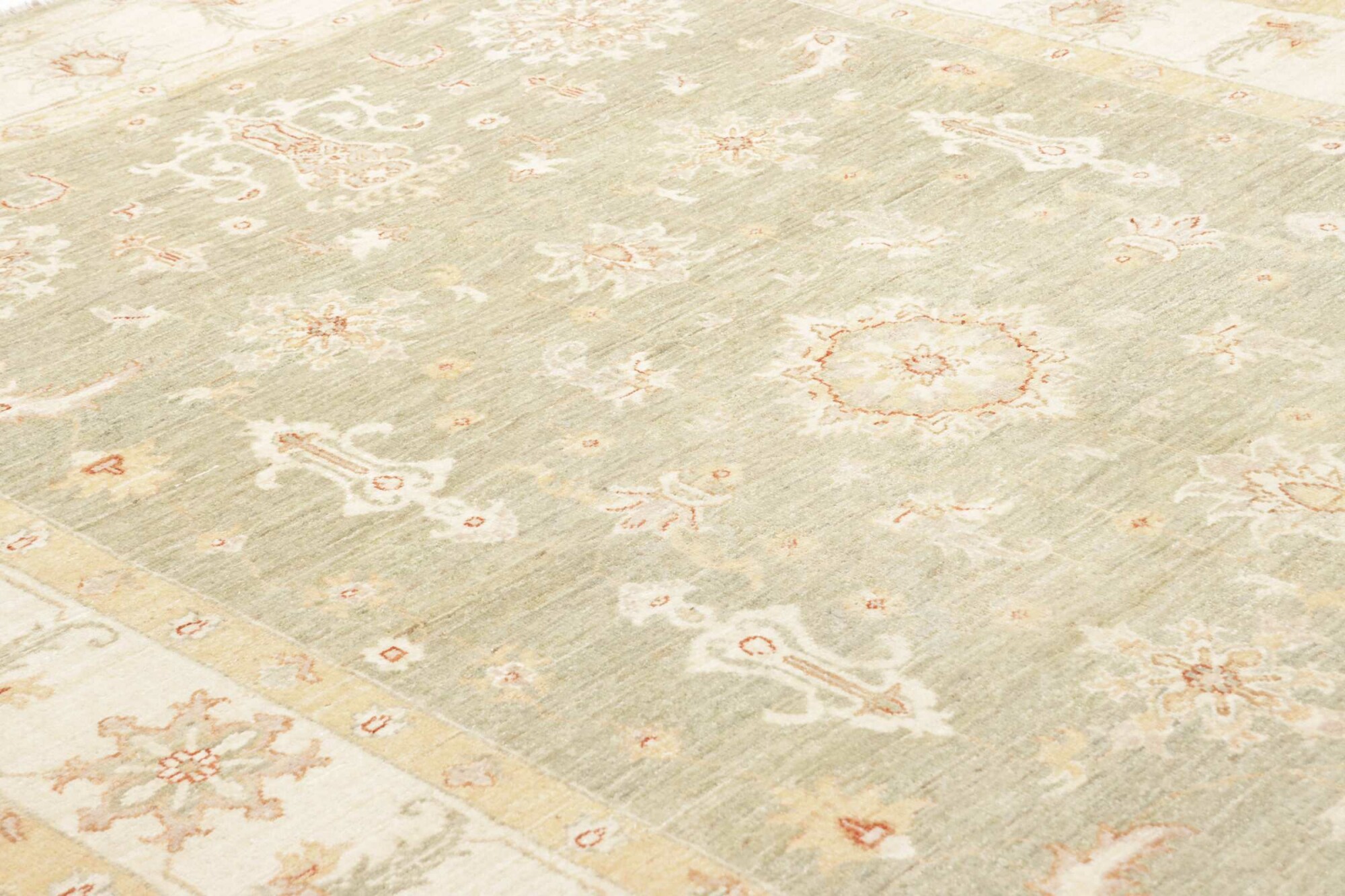 Die Komposition dieses Stückes zeigt ein symmetrisches, floral inspiriertes Allover-Muster mit feinen ornamentalen Details, das dem Teppich eine ruhige und zugleich ausdrucksstarke Präsenz verleiht. Die minimalistische Farbgebung unterstreicht den edlen Charakter und fügt sich harmonisch in moderne wie klassische Interieurs ein.