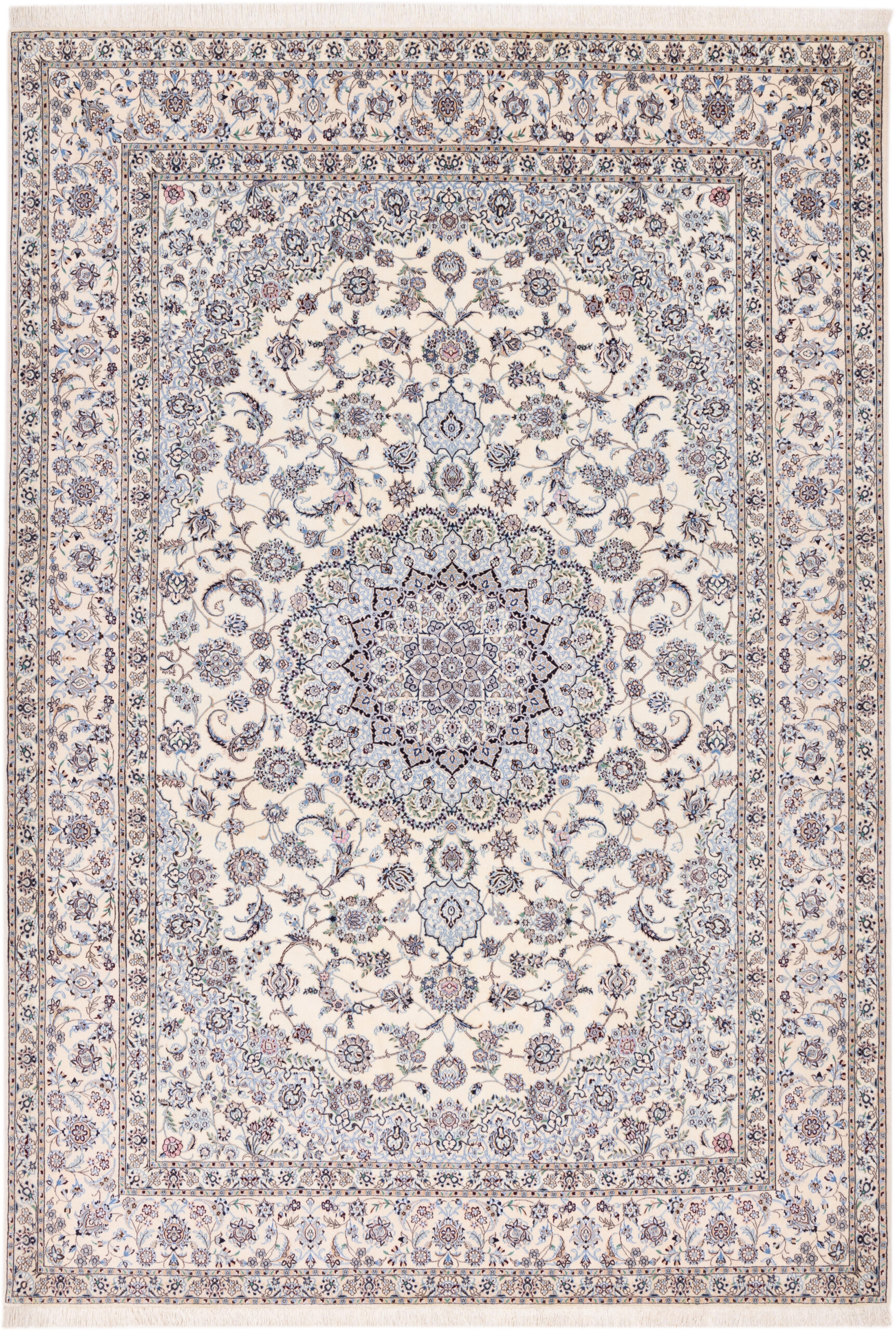 Nain aus hochwertiger persischer Schurwolle und Natur-Seide, handgeknüpft auf Baumwolle. Zentriertes Medaillon Design auf creme-weißen Grund, sowie einer creme-weißen Bordüre.