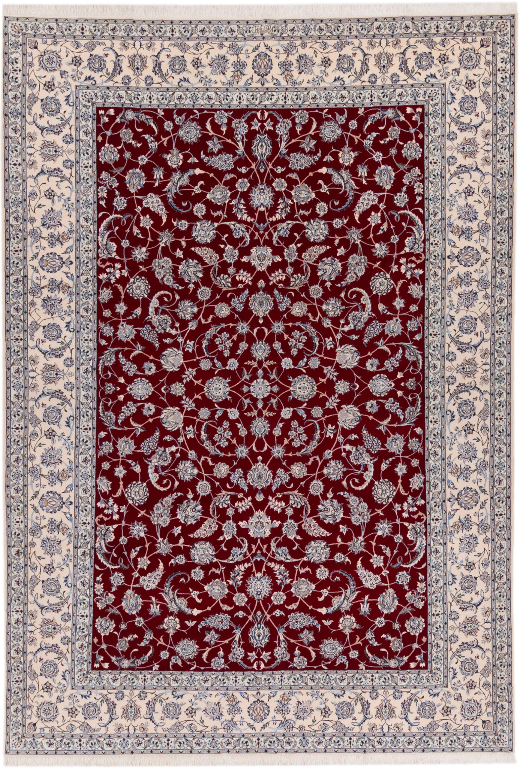 Nain aus hochwertiger persischer Schurwolle und Natur-Seide, handgeknüpft auf Baumwolle. Durchgemustertes Design auf rotem Grund und einer creme-weißen Bordüre.