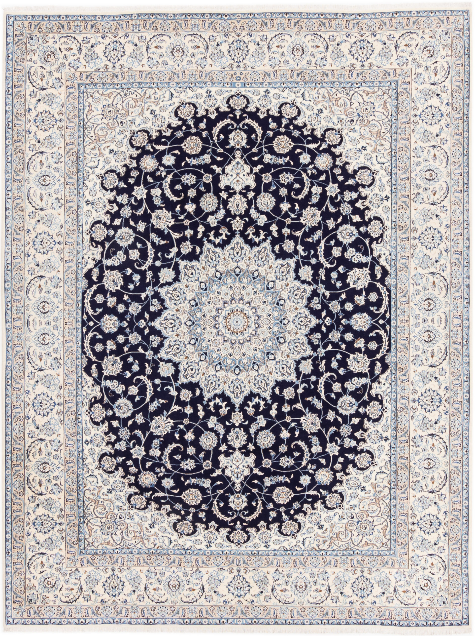 Nain aus hochwertiger persischer Schurwolle und Natur-Seide, handgeknüpft auf Baumwolle. Zentriertes Medaillon Design auf nacht-blauen Grund und einer creme-weißen Bordüre.